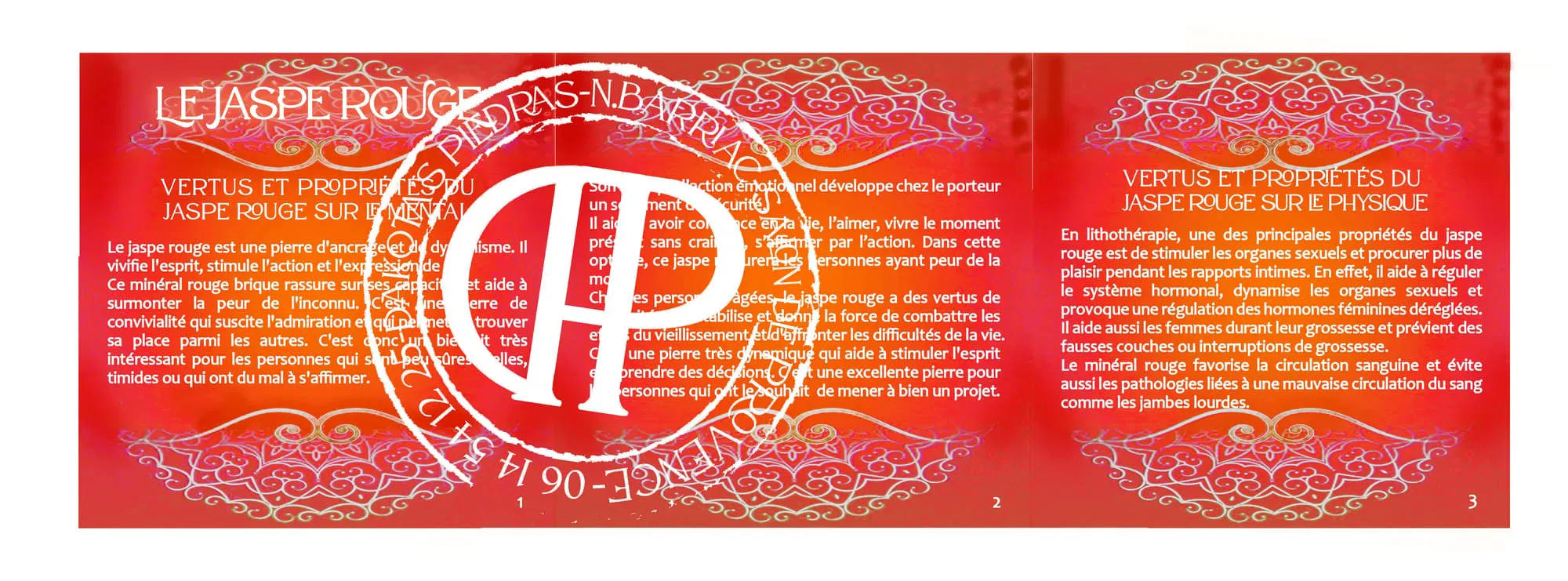 Chaque bijou est accompagné d'une plaquette explicative sur les vertus et les propriétés lithothérapeutiques des pierres qui le composent. Les informations délivrées sont issues de recherches approfondies de lithothérapeutes réputés (Boschiero, Hall, Gienger, Permutt...). Les pierres avec lesquelles je travaille proviennent de fournisseurs sérieux qui n’hésitent pas à faire tester leurs produits en laboratoire. Elles sont toutes naturelles.